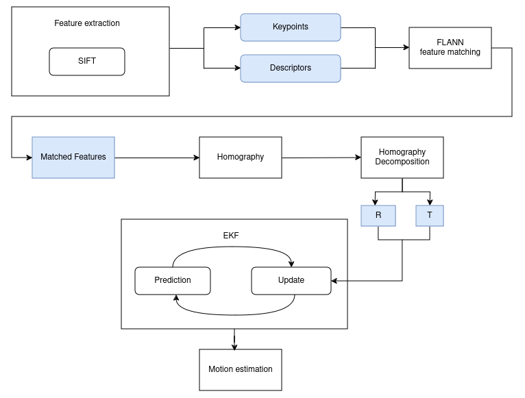 The core methodology involves using SIFT feature detection to extract key features from the images and FLANN matching to track these features across consecutive frames, allowing the estimation of the vehicle’s relative motion. Given that the down-looking camera views a predominantly planar surface, the system applies homography decomposition to interpret the scene and calculate the AUV’s motion. To enhance accuracy, the system integrates the visual odometry data with sensor inputs through an Extended Kalman Filter (EKF), which fuses visual information with altitude and yaw measurements. This fusion process refines the motion estimates, ensuring more stable and precise trajectory predictions.